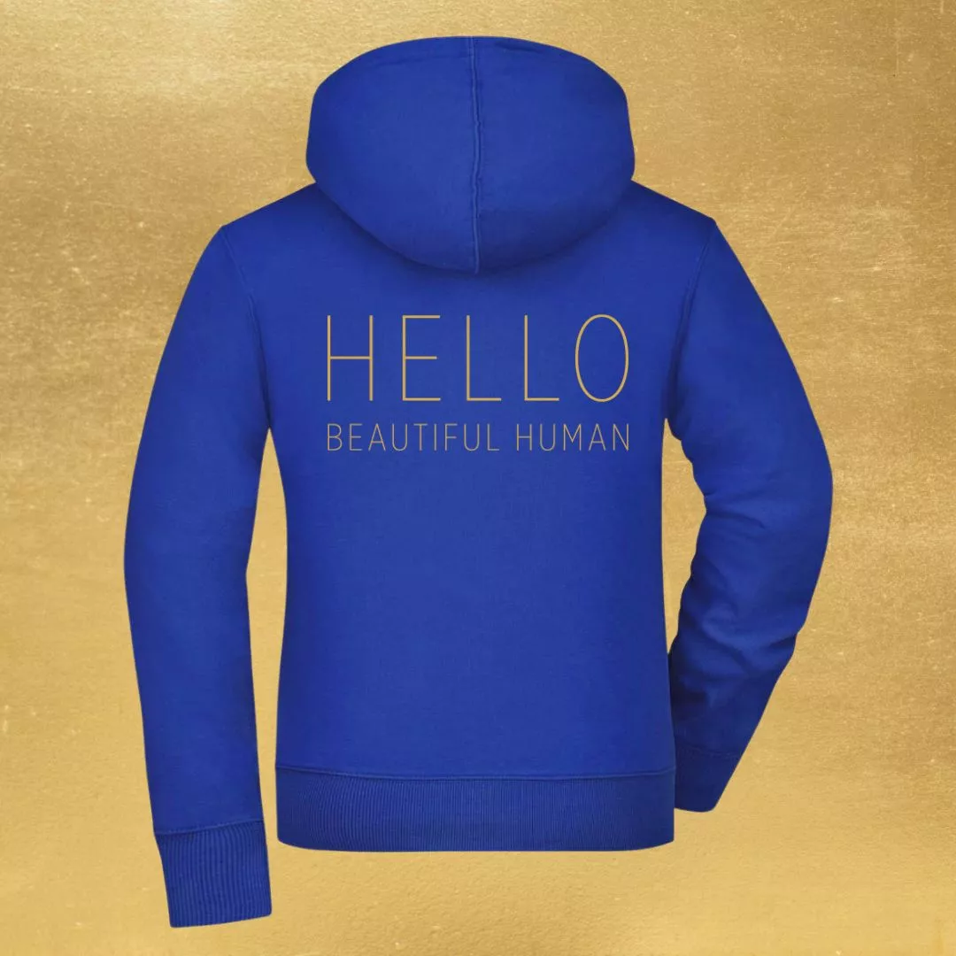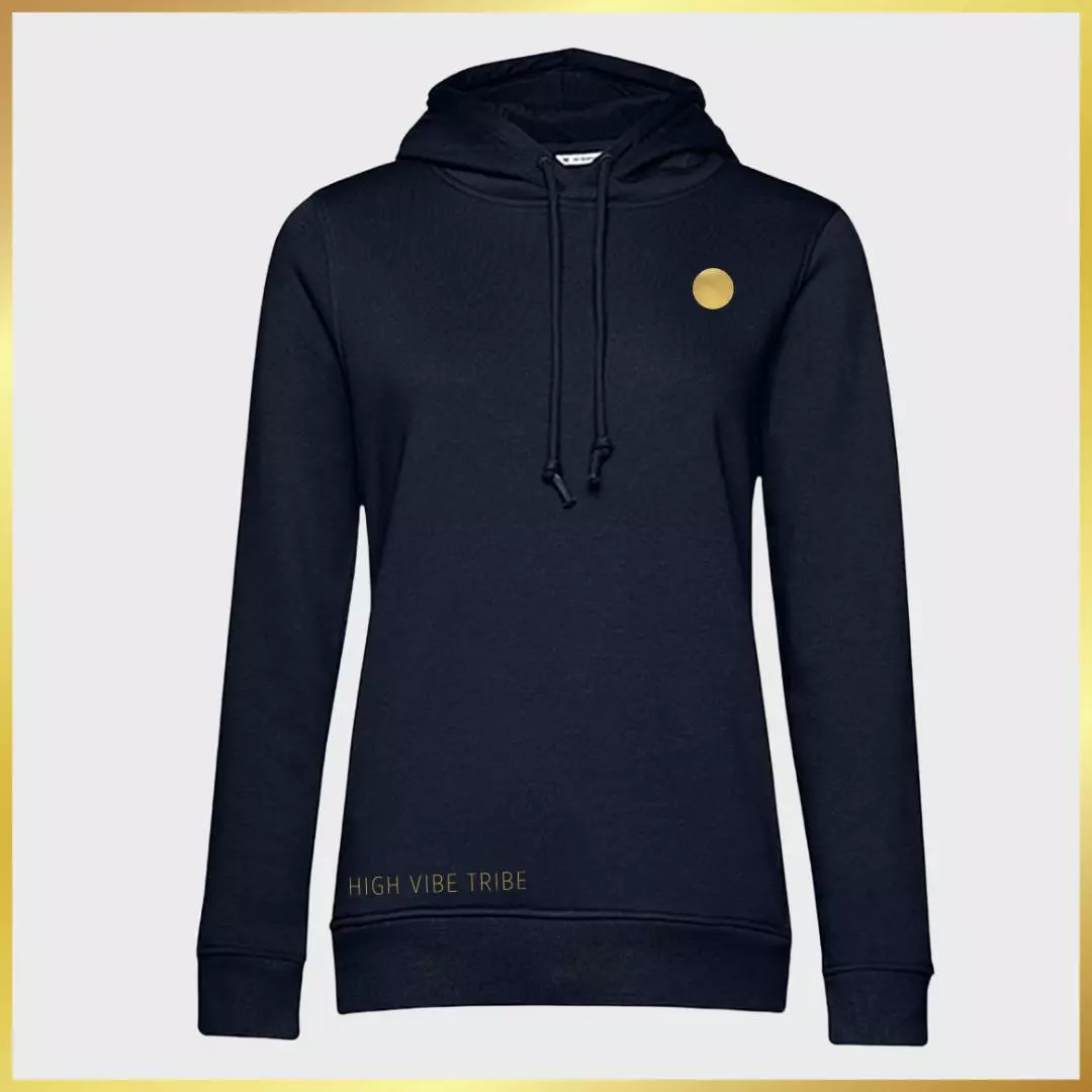 Hoodie for women in dark blue with subtle gold embroidery.