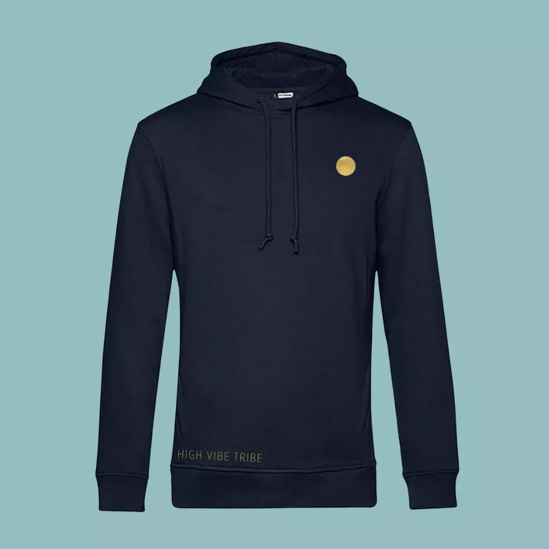 Hooded pullover for men and women in dark blue with subtle gold embroidery.