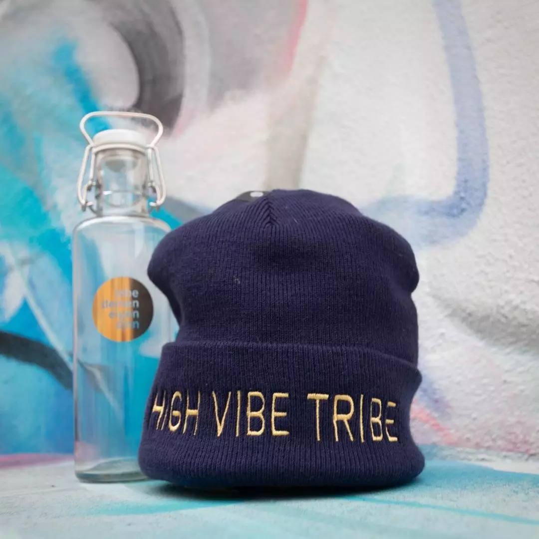 Dark blue pouch with zipper and gold print.