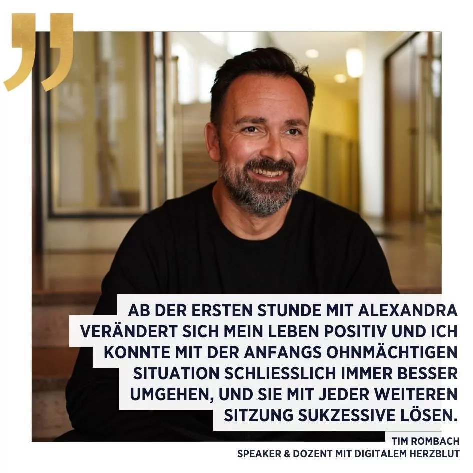 Ab der ersten Stunde mit Alexandra veränderte sich mein Leben positiv und ich konnte mit der anfangs ohnmächtigen Situation schließlich immer besser umgehen, und sie mit jeder weiteren Sitzung sukzessive lösen.